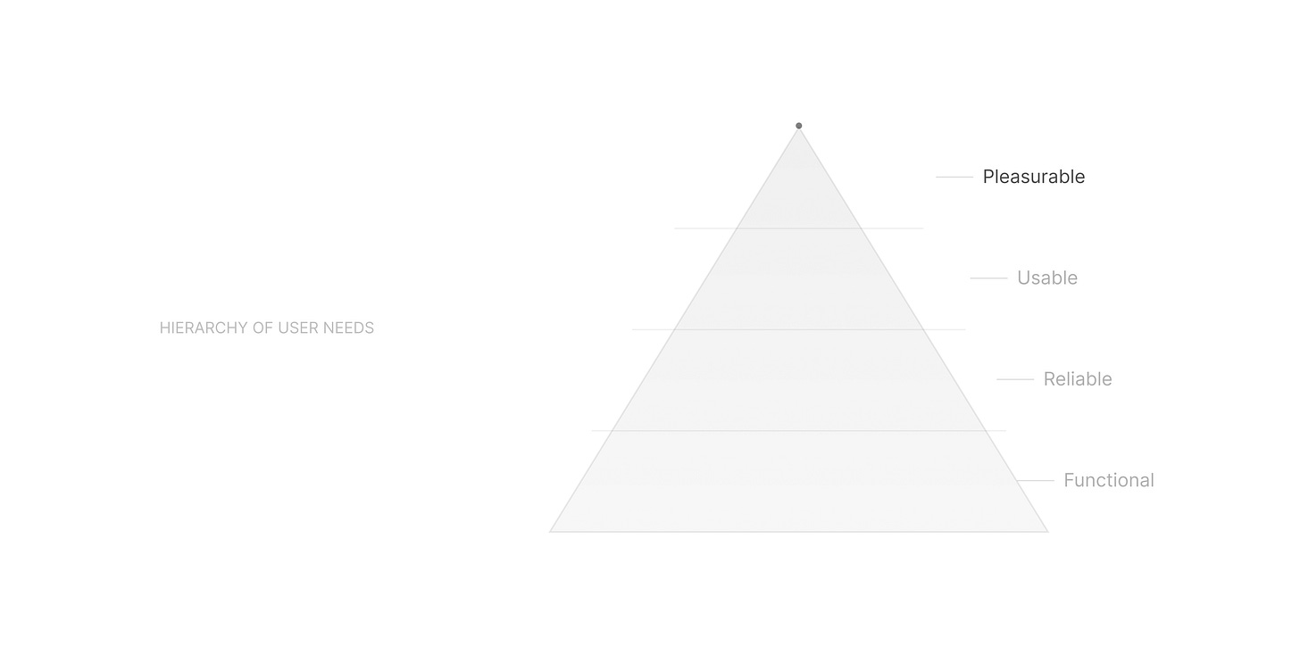 At the base: Functional. Does the product work? Above that: Reliable. Does the product work consistently? Then: Usable. Is the product easy to use? And at the top, the hardest and rarest layer: Pleasurable. Does it make people feel something?