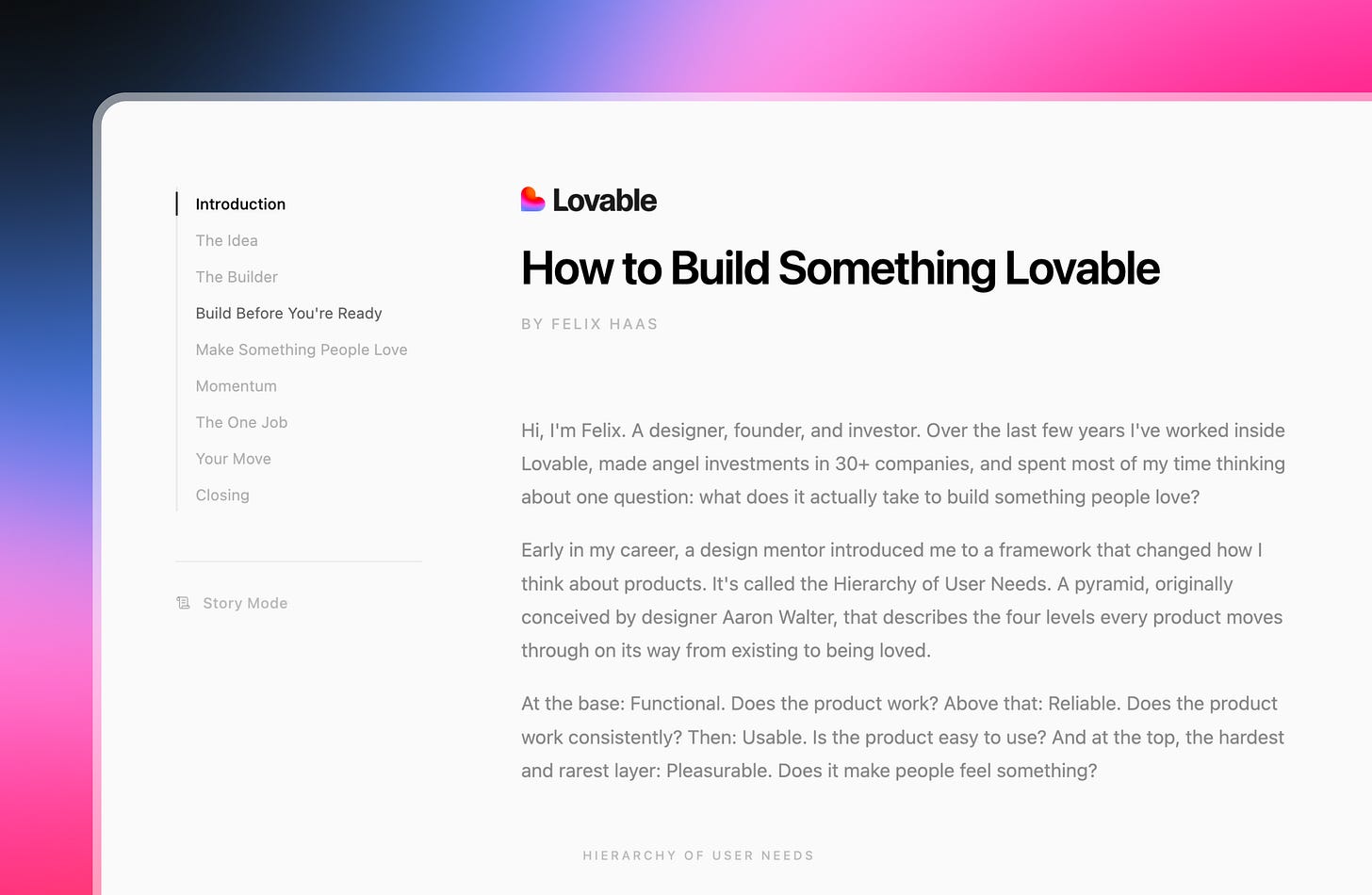 Hi, I’m Felix. A designer, founder, and investor. Over the last few years I’ve worked inside Lovable, made angel investments in 30+ companies, and spent most of my time thinking about one question: what does it actually take to build something people love?